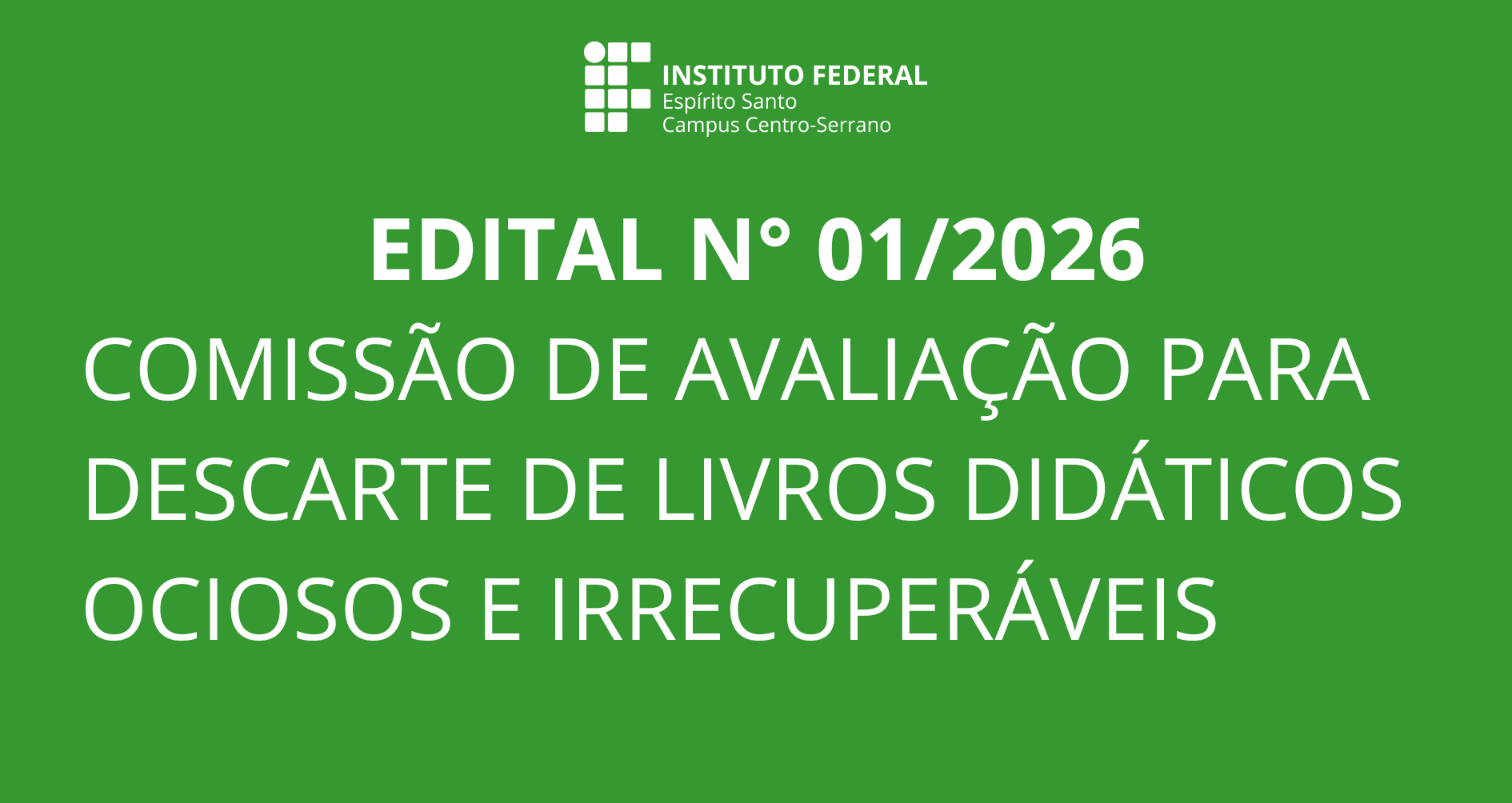 O Ifes – Campus Centro-Serrano lança o Edital nº 01/2026, referente ao desfazimento de livros didáticos considerados ociosos e...
